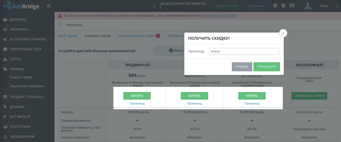 При выборе тарифа главный параметр, который учитывается, это количество визитов. Каждые 1000 перерасходованных визитов нужно оплачивать отдельно.