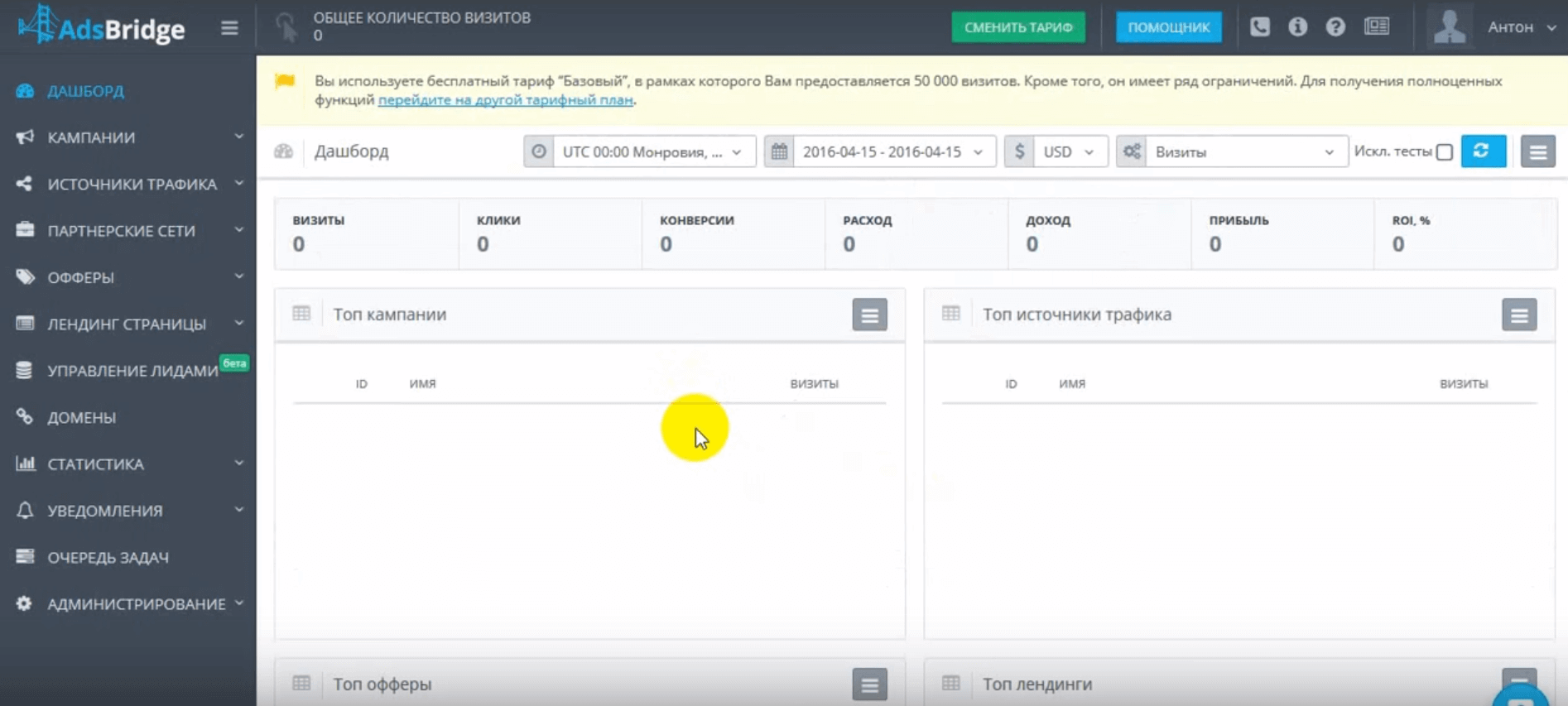 После того, как вы поработаете с трекером, на приборной панели вы сможете увидеть график визитов, кликов, расходов, доходов и прибыли за интересующий вас период времени. Также будут таблицы «Топ кампании», «Топ источники трафика», «Топ офферы», «Топ лендинги», «Топ страны» и «Топ типы трафика». Эта панель дает возможность быстро оценить ткущее состояние.