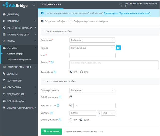 Офферы в понимании AdsBridge это партнерская ссылка. Настраиваются SubID параметры треккера. А если вы укажете размер вознаграждения, то автоматически будет рассчитываться ROI.