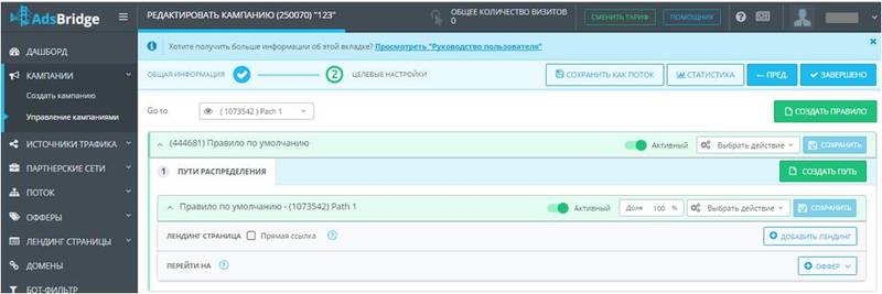 Далее настраивается таргетинг. Есть 2 варианта перехода: через лендинг или напрямую на оффер. Количество лендингов и офферов в компании неограниченно.