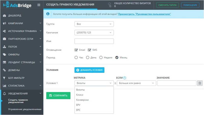 Вы определяет, по какой группе, компании вы хотите получать уведомление. Оповещение должно приходить по смс или почте. Также задаете условия для оповещения.