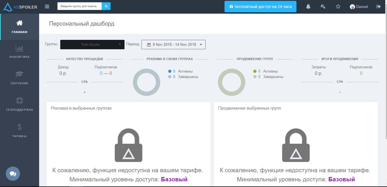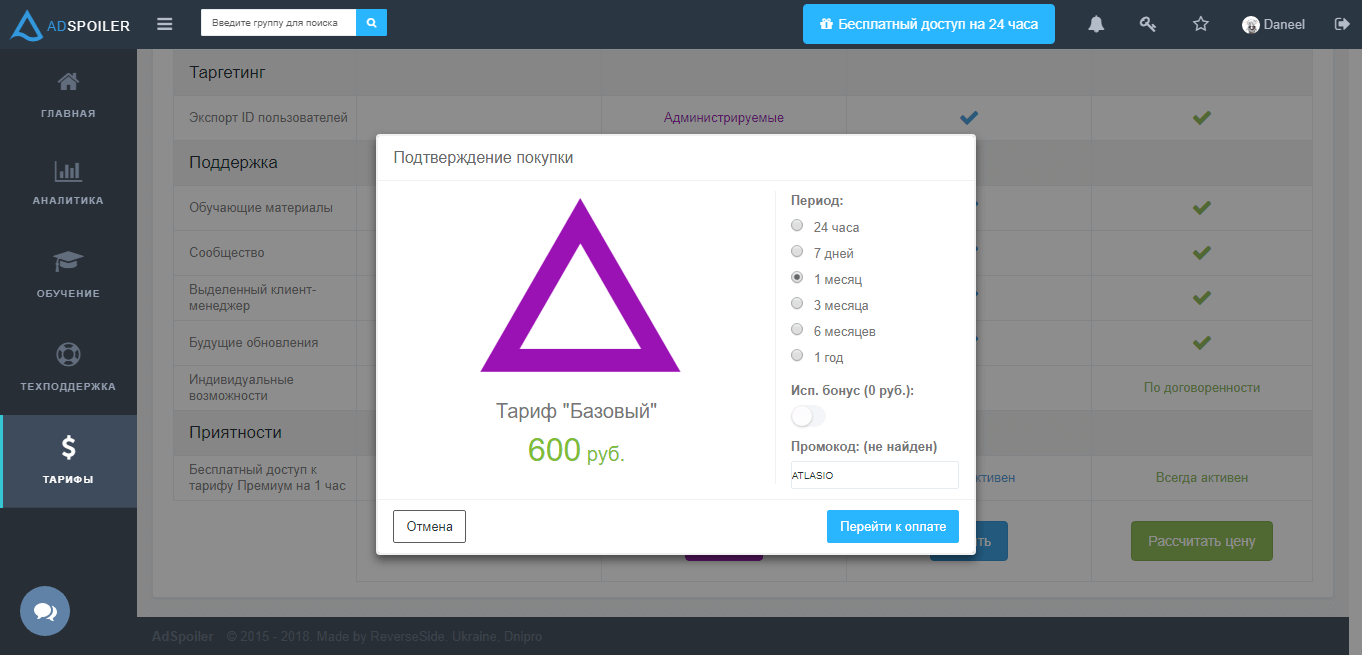 Базовый, для начинающих, стоит около 2,5 тысяч рублей за полгода. В этом тарифе включены: личные отчеты, аналитика ваших групп, почасовая активность рекламы, техническую поддержку.