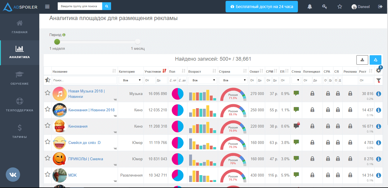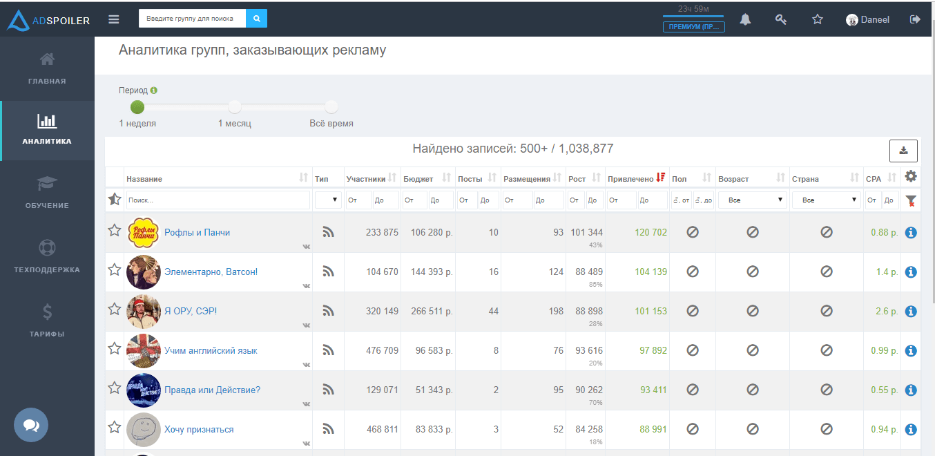 Adspoiler – это платформа, предназначенная для аналитики рекламы и групп в социальной сети ВКонтакте. Сервис начал свою работу в 2015 году и на нынешний момент может отслеживать рекламу в более 24000 группах ВК. Вы сможете продвигать свои площадки, привлекая к себе активных и реальных подписчиков.