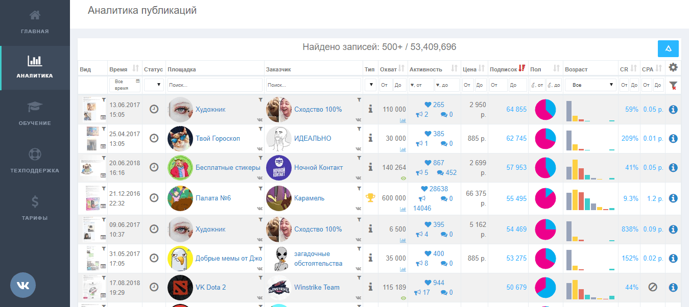 В приведенной таблице вы увидите название группы, категория группы в бирже, количество подписчиков, процент собачек, график по полу, возрасту и т.д. Особенно важными показателями являются цены за пост, охват записи, потенциал группы (прогноз количества участников, которые вы сможете получить через рекламный пост). Все эти данные можно сортировать по любому фильтру.