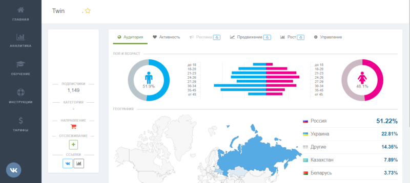 Здесь во вкладке “Мои группы” можно добавить свои продвигаемые группы, или же сообщества конкурентов для их последующего отслеживания. При переходе в саму группу отобразится вся известная информация о нём: количество подписчиков, категория, графики пола и возраста, география стран пользователей.