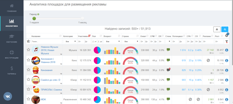 В этом разделе будет собрана вся имеющаяся статистика сообществ, которые показывают рекламу для своего продвижения. Используя эти данные, вы сможете узнать, какие группы активно продвигаются, и найти среди них своих конкурентов.
