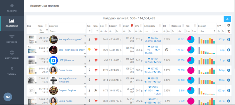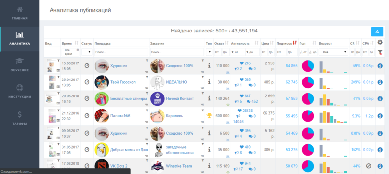 В этой таблице будут показаны общие данные всей рекламной кампании заказчика при помощи одного и того же поста в разных группах. При помощи этой аналитики, вы сможете оценить эффективность контента, которые использовались при рекламе в сообществах. Здесь также можно фильтровать данные по требуемым параметрам.
