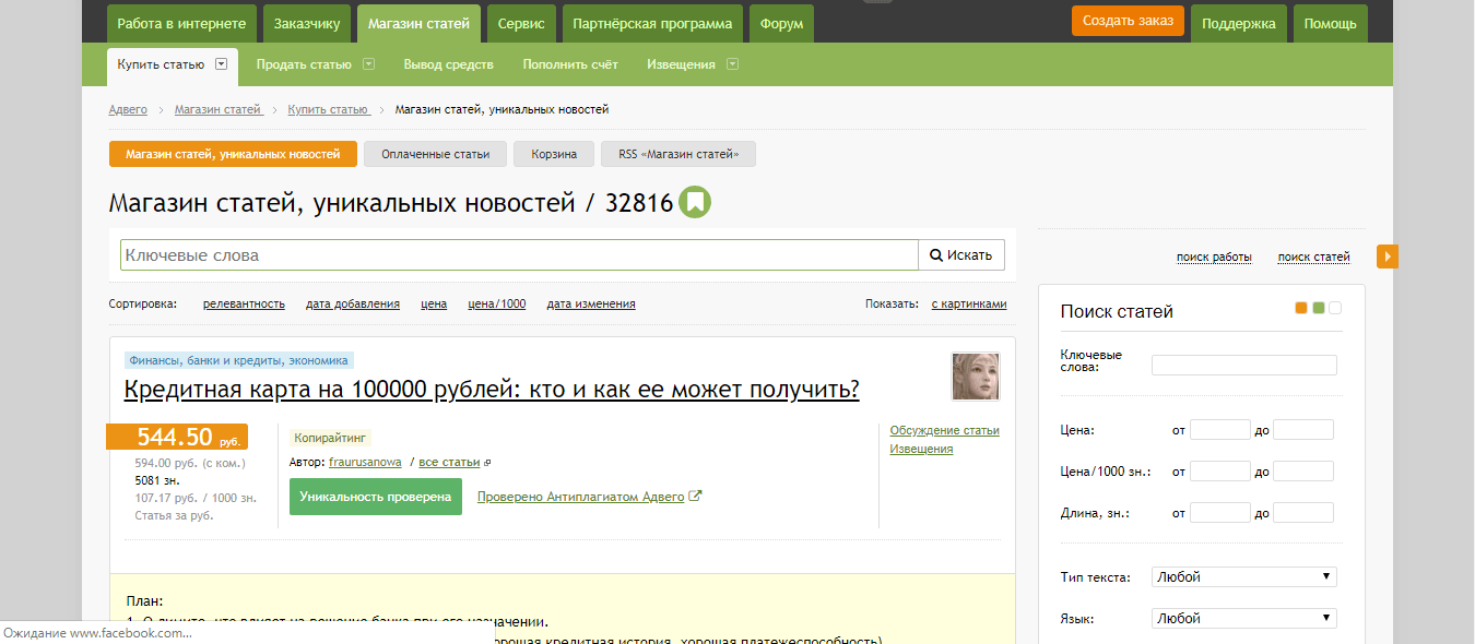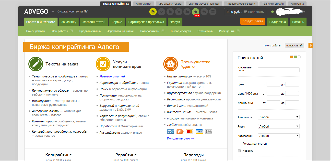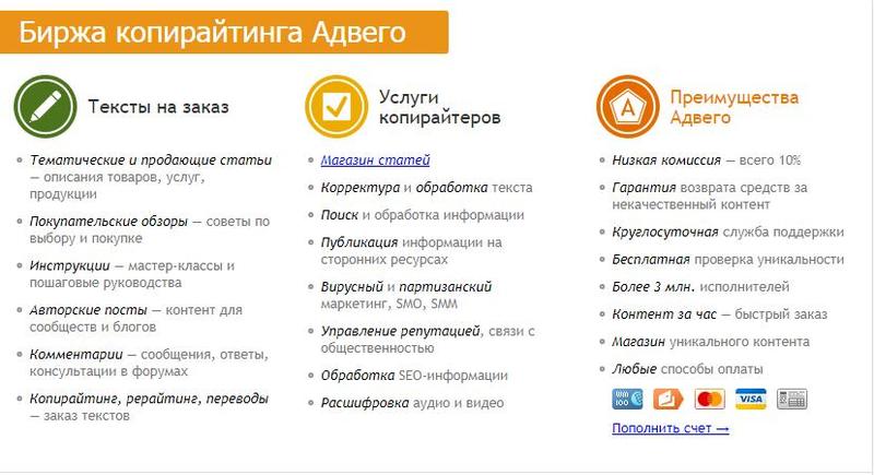 Такой сайт, как Advego, известен всему Рунету. Данная биржа контента предоставляет качественные услуги и уникальную площадку взаимодействия между заказчиками и исполнителями. Отзывы в сети говорят, что портал использует особый подход при разработке контента.