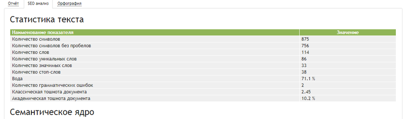 - Семантическое ядро или часто встречающиеся слова в тексте. Очень часто копирайтеры вставляют в текст ключевые слова, поэтому программа установила предел до 3,5%.