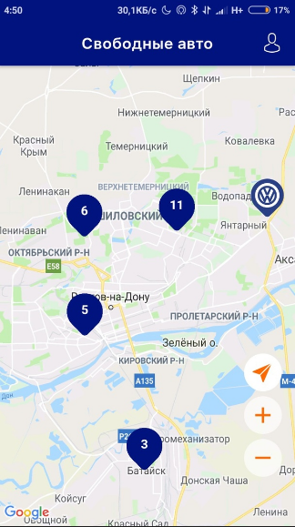- Через поисковую систему мобильной программы найти автомобили расположенные в радиусе доступности и забронировать его;