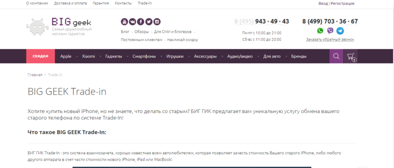 Если вы хотите купить новый айфон и у вас есть старый, то вам доступно выгодное предложение. Магазин предлагает программу Trade-in, по которой вы можете сдать старый IPhone или другую технику от Apple и получить скидку на новый аппарат, равную стоимости вашего телефона. Для того, чтобы оставить заявку нужно перейти по вкладке “Trade-in”.