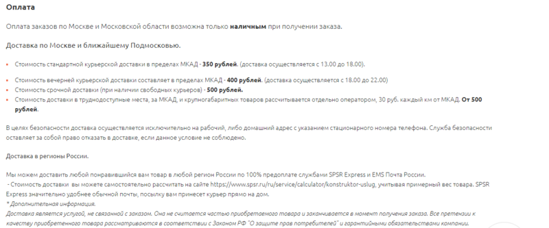 Доставка товаров возможна по всей территории России. В Москве и Московской области магазин сам доставляет заказы своими курьерами, в другие города и регионы службами доставки SPSR EXPESS и EMS.