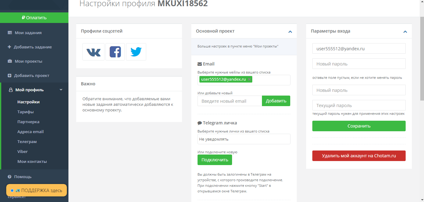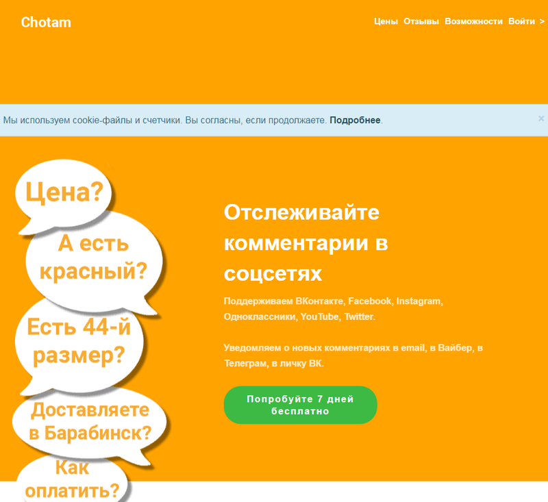 «Chotam» - один из самых популярных сервисов, предназначенных для осуществления мониторинга комментариев в социальных сетях: Одноклассники, ВКонтакте, «Facebook», «Instagram», «Твиттер», «Ютуб». Система позволяет создать настройку, для отслеживания комментариев под определенным постом, и выполнять автоматическую рассылку уведомлений на «Телеграмм», либо заданный адрес электронной почты. Отслеживать можно не только собственные посты, но также и мониторить сторонние сообщества, отдельные страницы, записи и т.д. Настройка системы оповещения является достаточно гибкой, позволяет выполнять объединение комментариев в соответствии с общими ключами, осуществлять оповещения по различным заданным контактам.