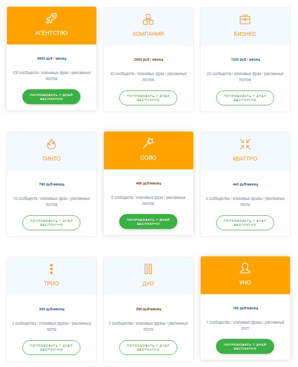- «Уно» - изначально идет в виде тестовой недельной программы для освоения сервиса, далее стоимость активации пакета составляет 190 рублей в месяц, включает в себя работу с одной группой, ключевым словом, постом;