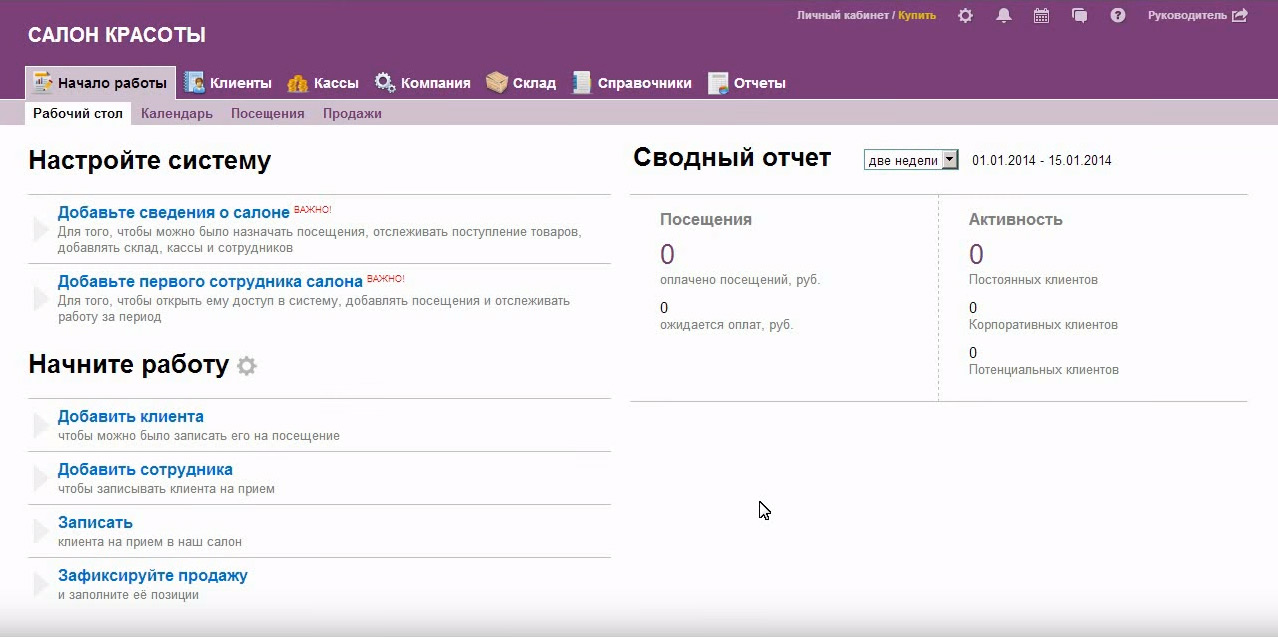При создании аккаунта пользователю нужно указать название копании, e-mail, номер телефона, контактное лицо и выбрать конфигурацию (автошкола, салон красоты, стоматология и прочее), что позволит автоматически подстроить под вид вашей деятельности структуру программы.