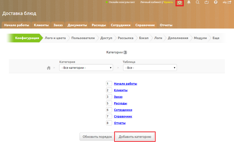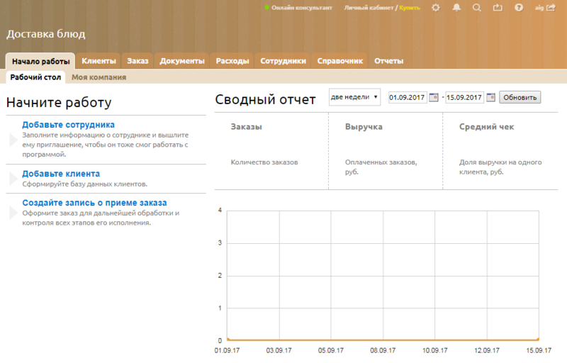 После создания аккаунта вы попадаете в личный кабинет. На рабочем столе можно наблюдать за выбранный период сводный отчет, где, например, для конфигурации «Доставка блюд» указывается количество заказов, выручка и средний чек.