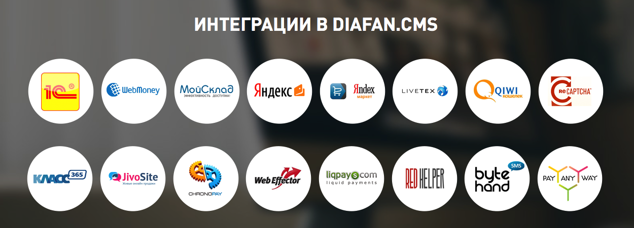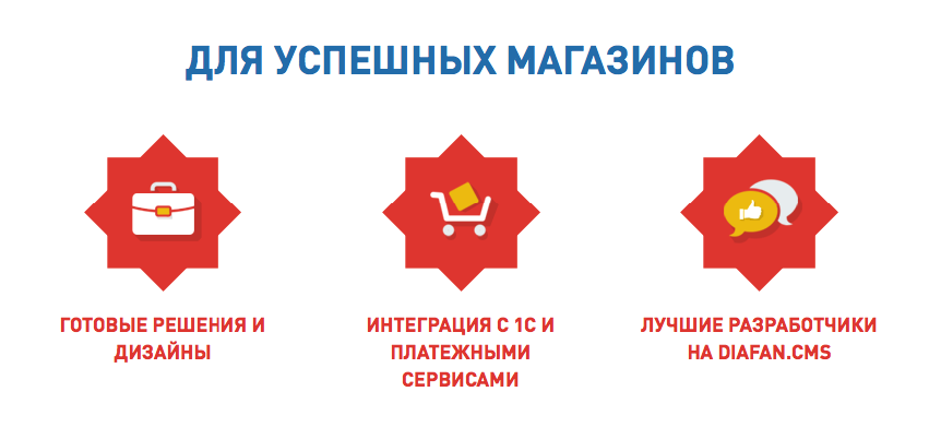 Конечно, обеспечена интеграция с 1С и платежными сервисами. Высокая эффективность CMS и комфорт работы на SaaS одинаково доступны посетителям diafan.ru. С помощью одной площадки вы можете создать не только собственно магазины, но и блоги, форумы. Парк шаблонов систематически обновляется, структурированы они неплохо. Причем не только по тематике, но и по целевому типу сайтов или их направленности.