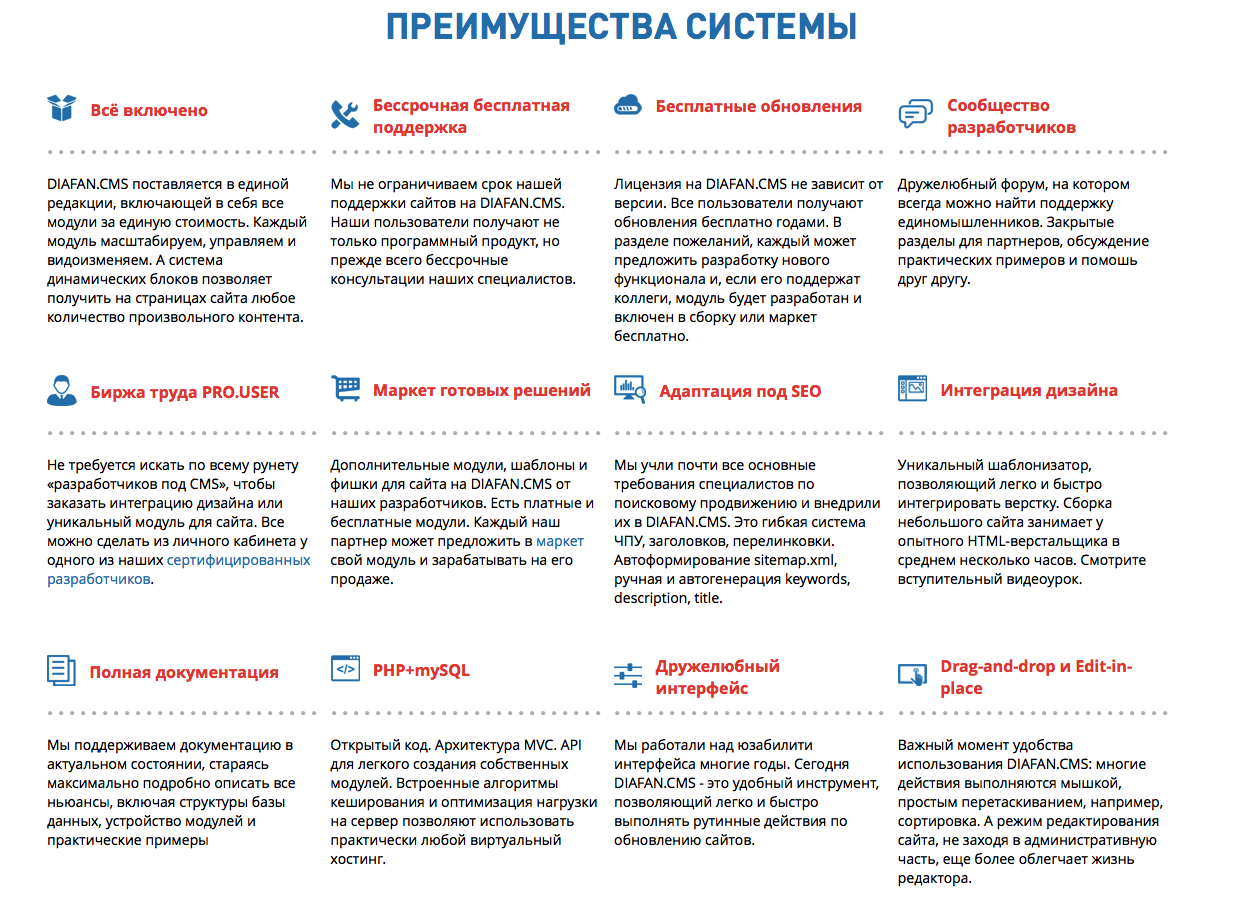 Болезненным во многих случаях вопросом является оперативность работы техподдержки; так вот, на данном сервисе эта проблема успешно решается. Более того, уже изначально гарантирована наилучшая сео-оптимизация, очень хорошо реализован и метод шаблонизации. Исходный движок DIAFAN позволяет воплотить какой угодно замысел, от элементарной визитки либо лендинга до крупных, солидных порталов.