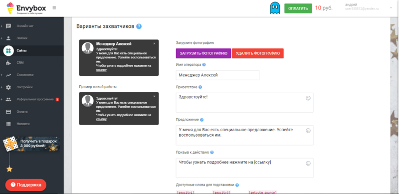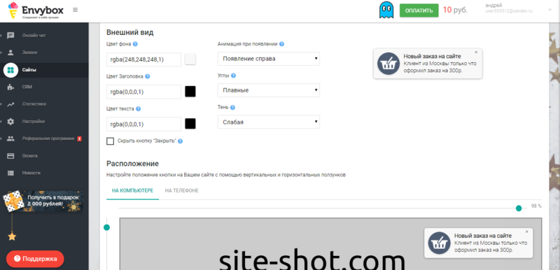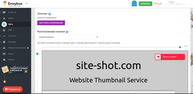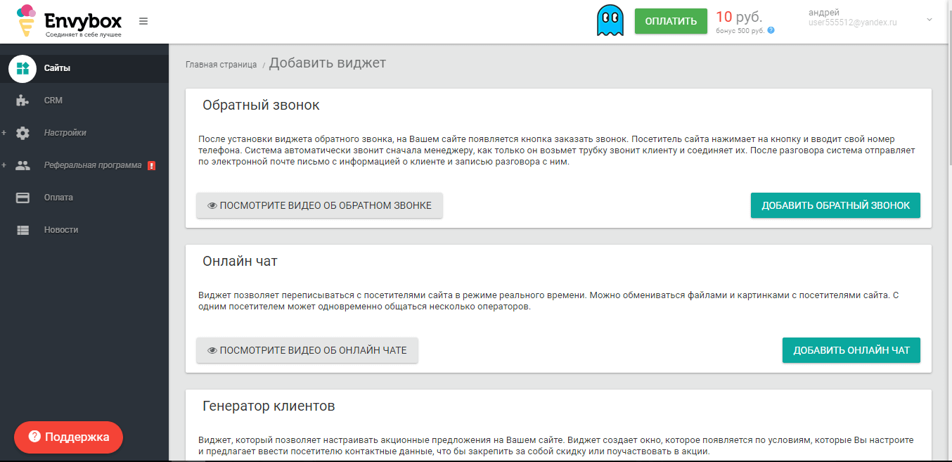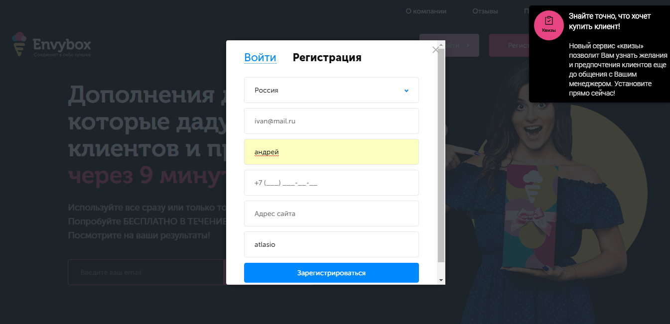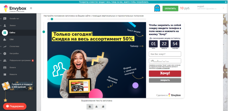 Envybox - это мультисервис, направленный на привлечение пользователей и увеличение дохода интернет магазинов и сайтов. Для этого сервис создал более 9 многофункциональных инструментов, которые позволят удержать и привлечь внимание посетителей вашего сайта.