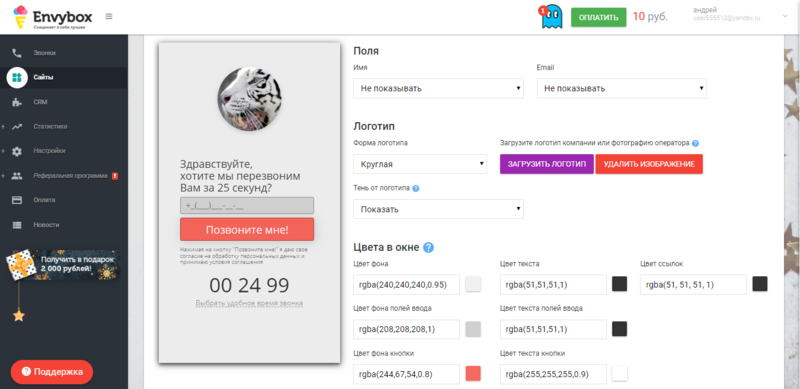 При установке специального кода на сайт, у ваших посетителей появится маленькое окошко с полем ввода номера. Как только пользователь введёт номер своего сотового телефона, сервис автоматически звонит вашему сотруднику колл-центра. Сразу же, после того, как сотрудник поднимет трубку, Envybox набирает пользователя, связывая его с вашим работником. После окончания звонка, вам на почту придет письмо с информацией о клиенте и сама запись разговора. Пользователь в свою очередь может определить комфортное время для совершения звонка. Внешний вид виджета, текст сообщения и логотип можно настроить в личном кабинете.