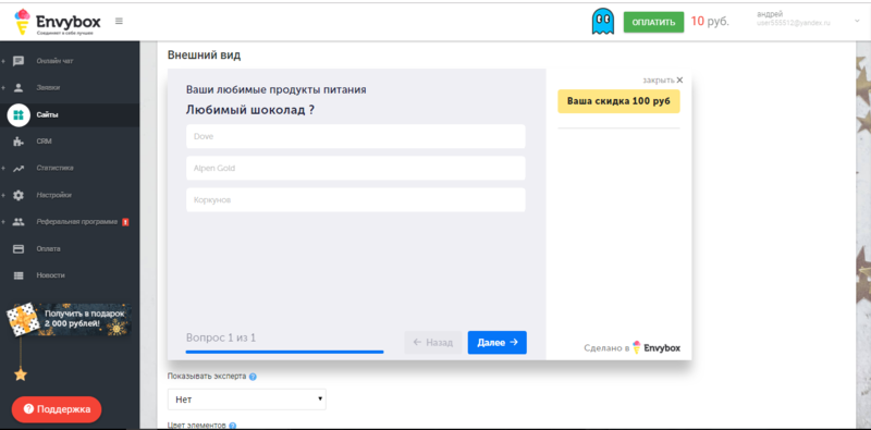 Посетителю откроется окно с заготовленными вопросами и вариантами ответов. Данный инструмент поможет собрать информацию о своих клиентах, оценить уровень обслуживания и т.п. Также можно предложить скидку за прохождение опроса.