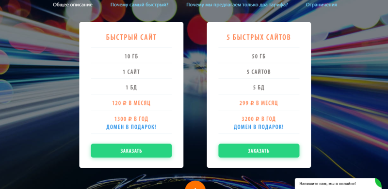 Пять быстрых сайтов, в свою очередь тариф оснащен пятьюдесятью гигабайтам дискового пространства, в пользование предоставлено пять сайтов, соответственно, пять FTP-аккаунтов и такое же количество баз данных.
