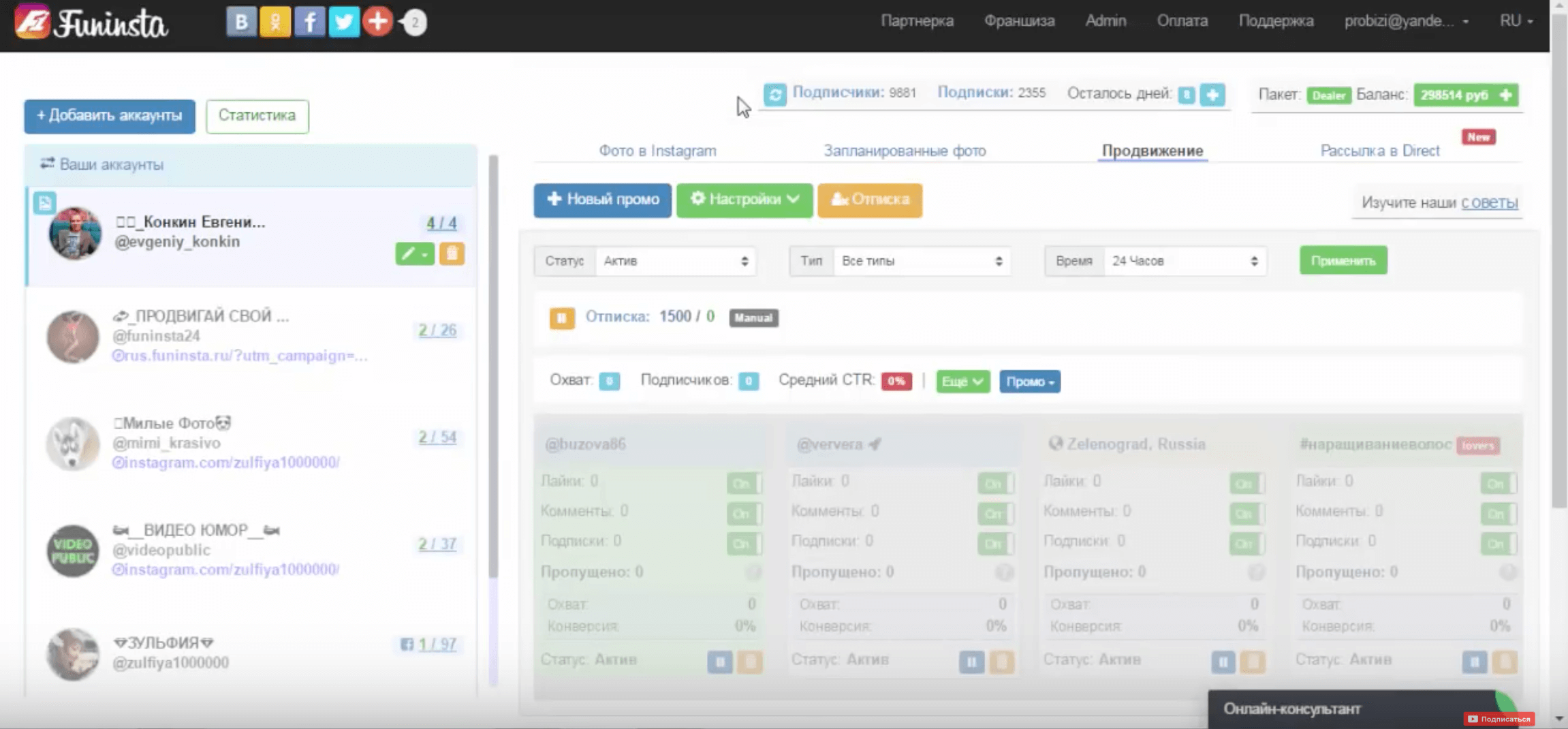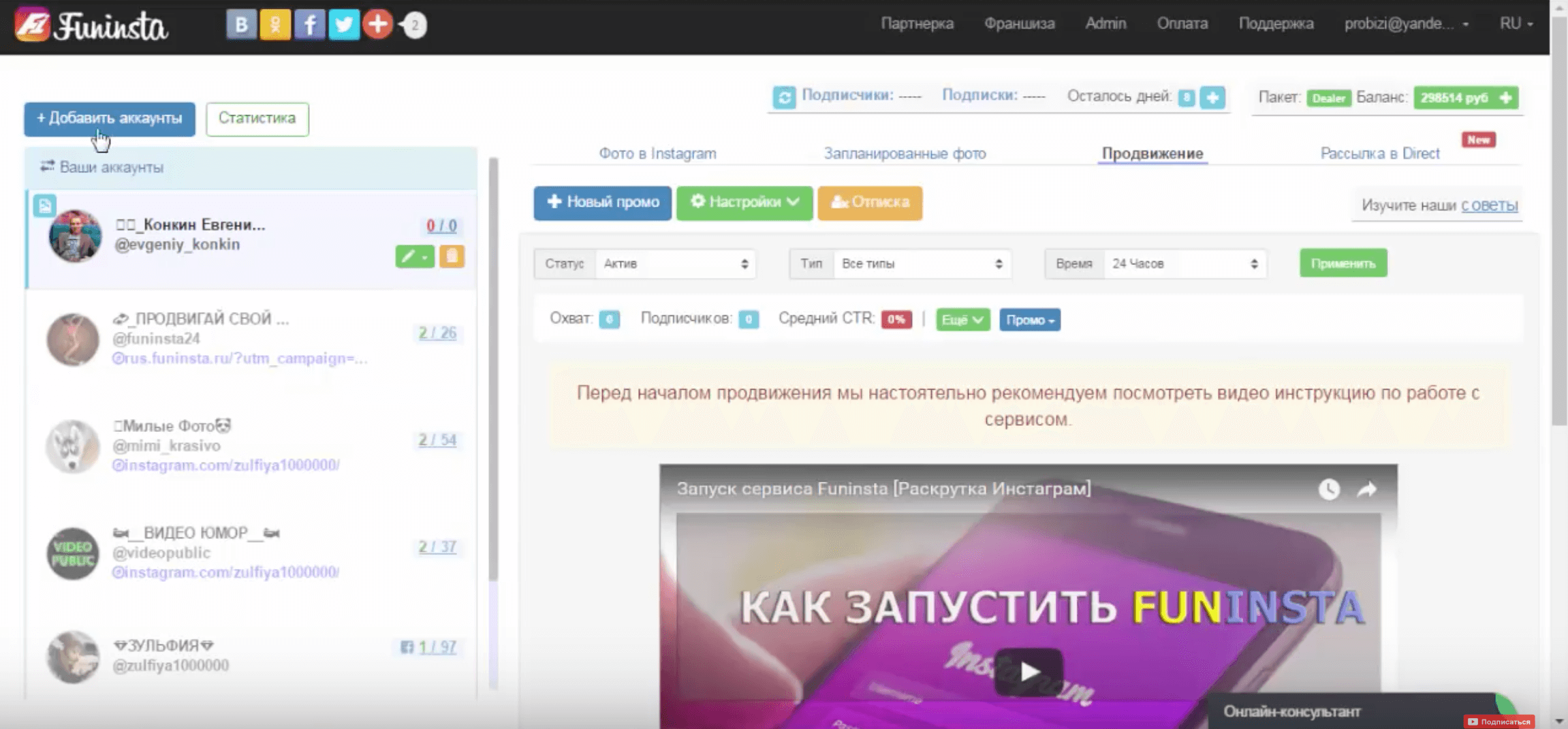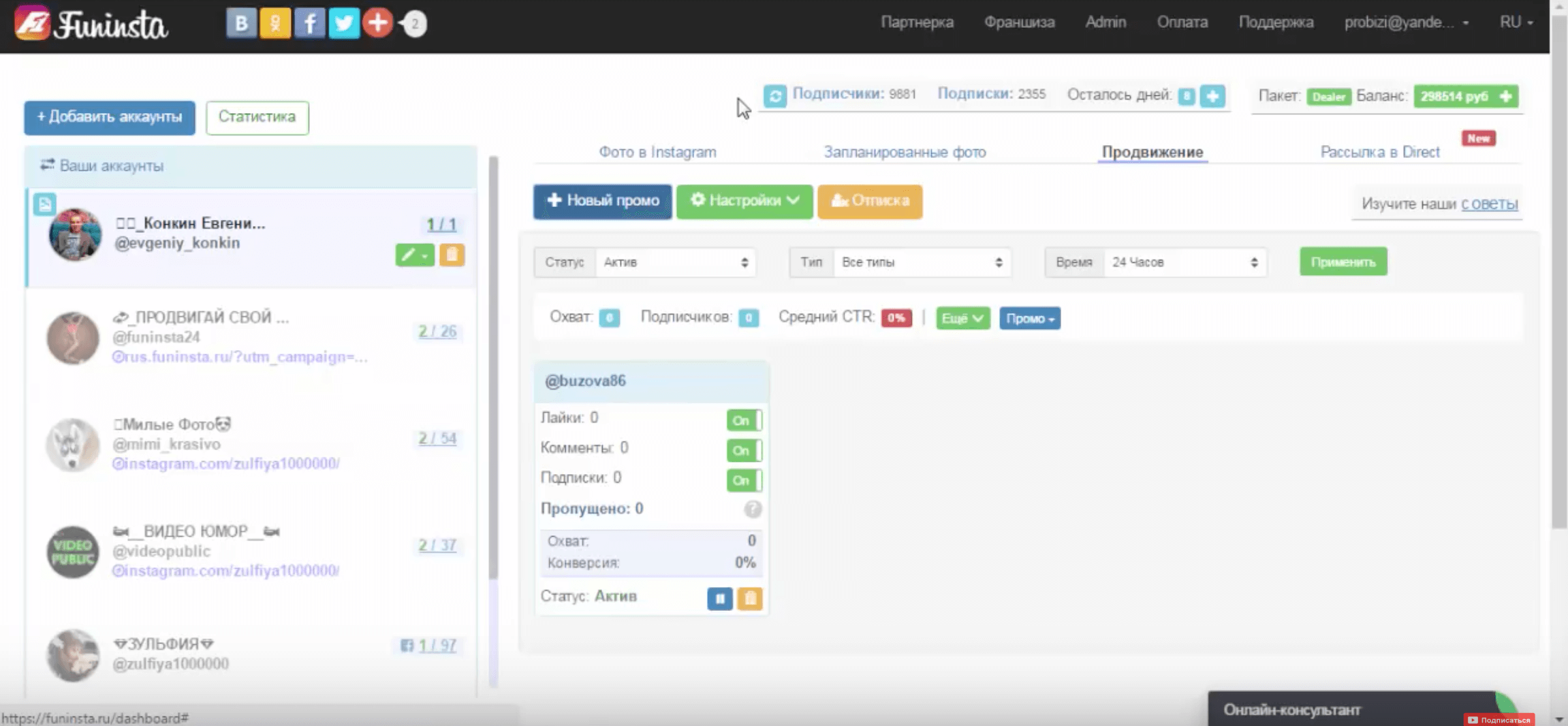 Поле этого вам будет доступен личный кабинет где можно будет увидеть всю необходимую информацию по вашему профилю. Тут вы можете увидеть статус продвижения ваших аккаунтов, просмотреть посты, комментарии и direct.