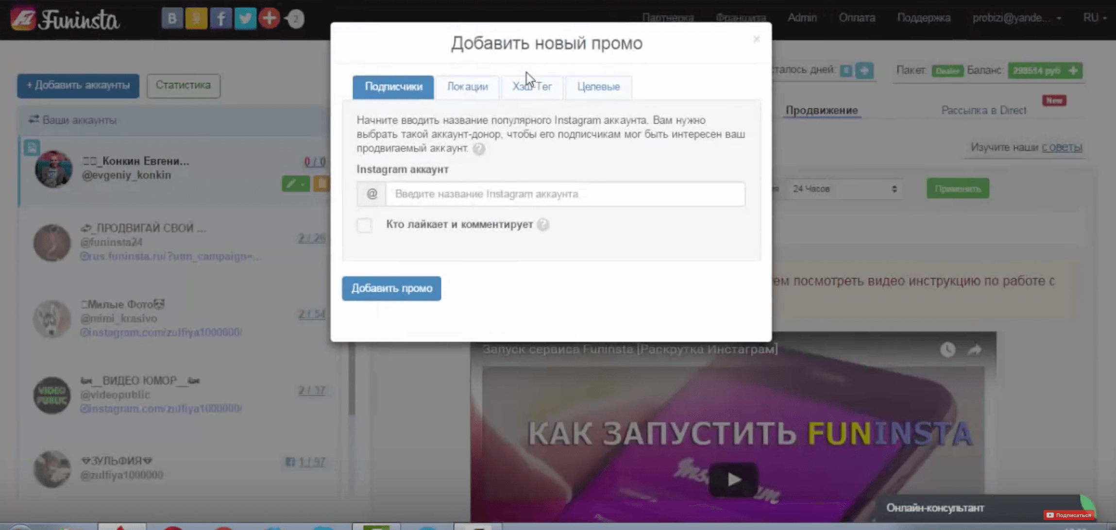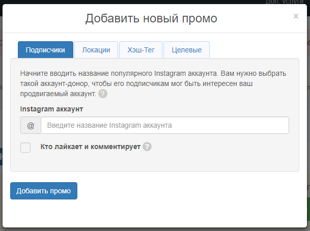 Далее, для продвижения аккаунта, нужно будет нажать на кнопку “Добавить промо”. И вам откроется меню, где нужно указать необходимые вам параметры. То есть выбрать удобные вам способы раскрутки.