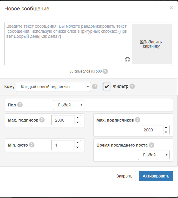 А встроенный фильтр позволит вам отправлять сообщение только тем, кто проходит по выбранными вами критериям. Например, по полу, по количеству подписок, по времени последнего поста. Текст сообщения вы выбираете сами.