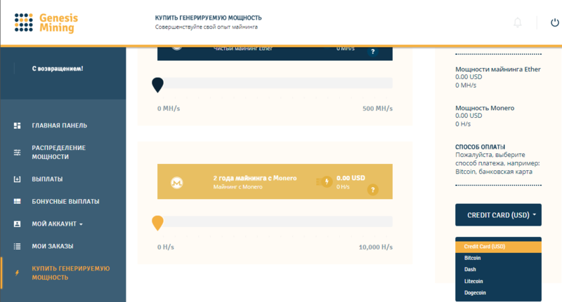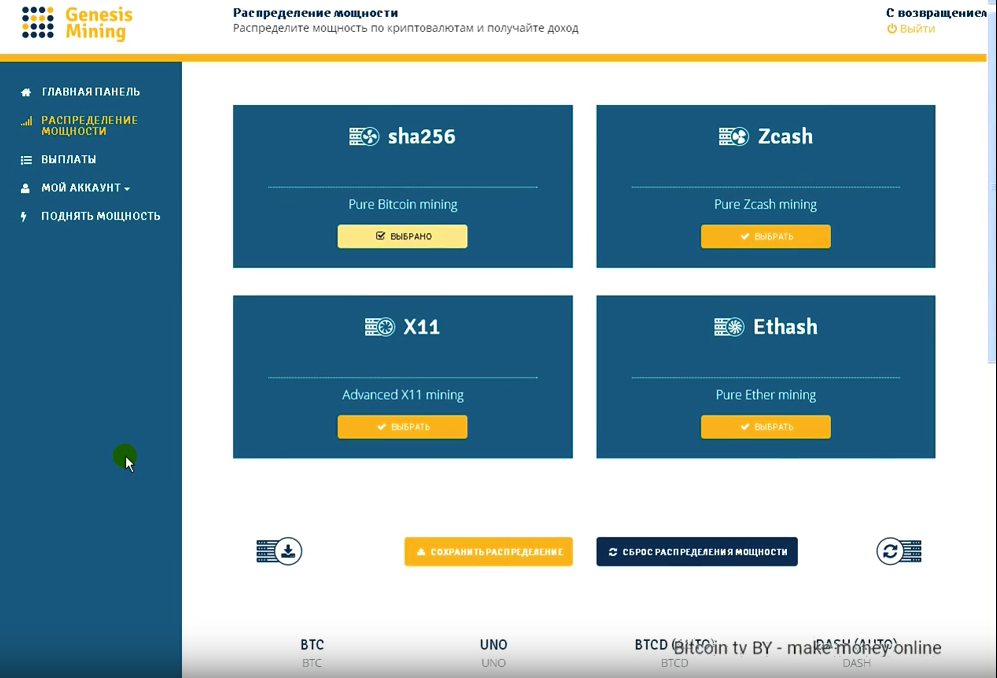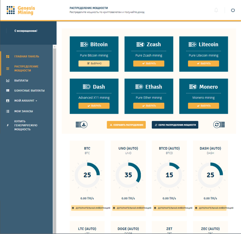 Особенностью сервиса является то, что клиенты сами решают на майнинг каких криповалют тратить приобретенную мощность. Распределение мощности производится просто и понятно.