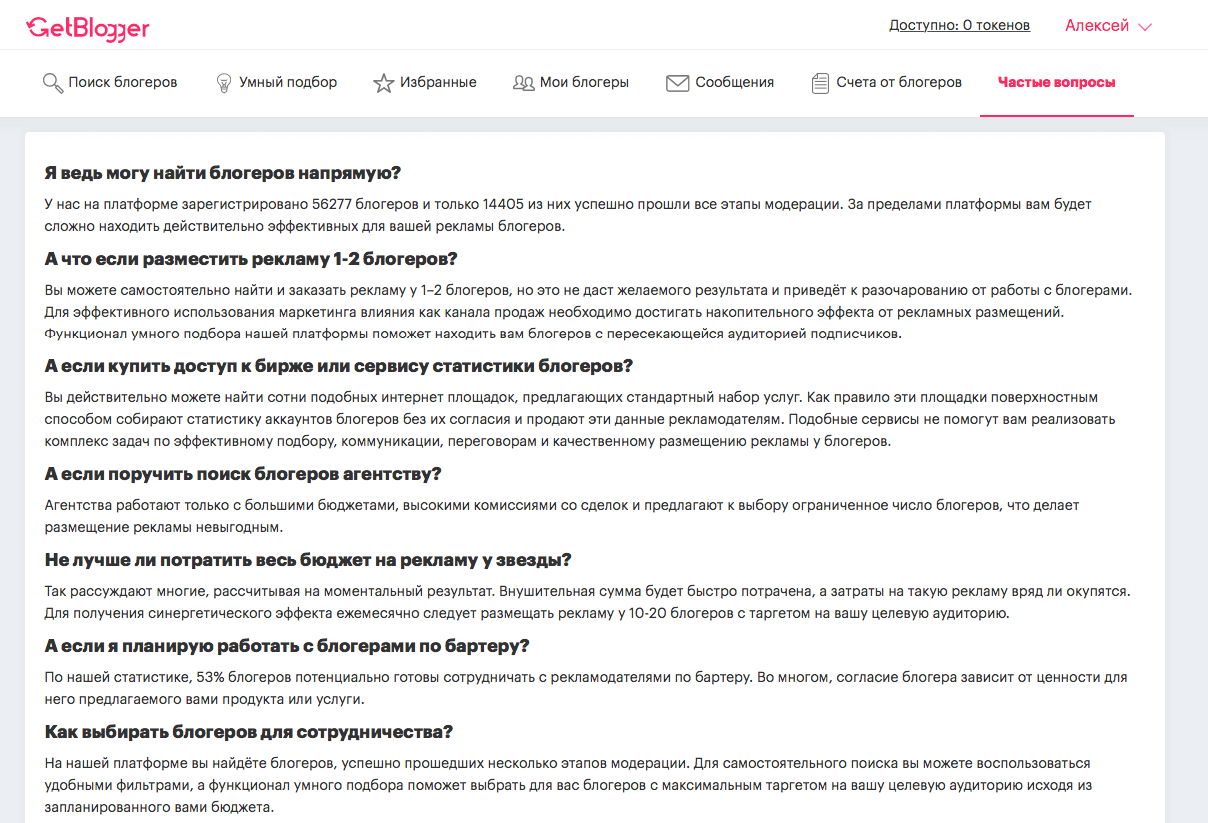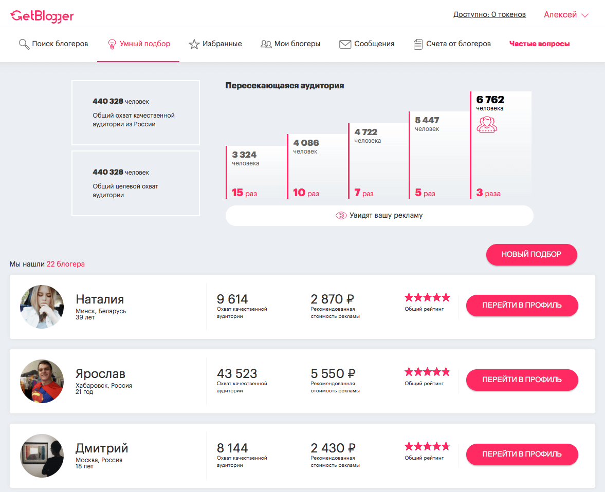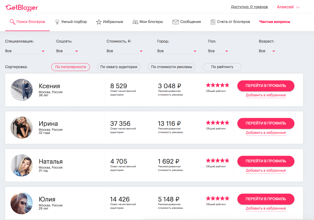 Стоимость услуг начинается от 12 тысяч рублей, на которые покупаете токены, которые вы тратите не услуги поиска блогеров. А для этого, чтобы блогер получил доступ к площадке, нужно выполнить следующие требования: наличие 5000 тысяч подписчиков, половина аудитории канала или страницы должна быть из России.