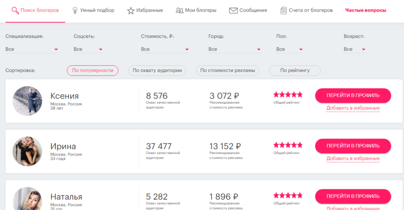Здесь вы можете выбрать таргетинг пользователей по вашей тематики. Для этого над списком присутствуют соответствующие фильтры. Можно разделить список по следующим параметрам: по возрасту, полу, географическому местоположению. Сортировку блогеров также можно настроить: по популярности, охвату аудитории, стоимости рекламы или по рейтингу.