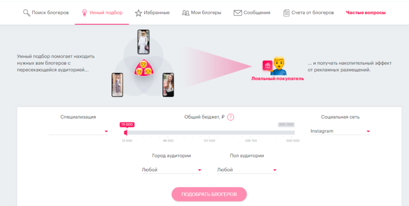 Также сервис предлагает уникальную систему отбора блогеров. Площадка сама подберет исполнителей у которых пересекается аудитория пользователей. То есть ваш потенциальный клиент увидит ваш бренд сразу в нескольких местах, тем самым он запомнит вас.