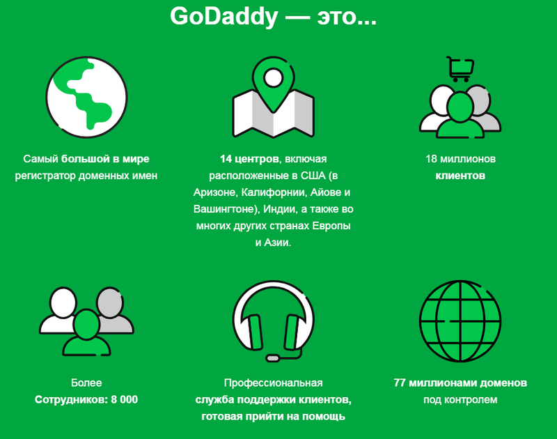 «Godaddy» представляет собой один из самых крупных регистраторов во всем мире, предоставляющего обширный ряд услуг в области хостинга (виртуальный хостинг, VDS/VPS, приватные и выделенные сервера, «ССЛ» сертификация, выделенные сетевые адреса, а также ряд предложения для реселеров). Общее число клиентов составляет порядка 18 миллионов, количество работников более 8 тысяч, в 14 центрах расположенных в различных городах мира, подконтрольные домены уже перешли отметку в 77 миллионов. Основной центр компании располагается в Соединенных Штатах, городе – Саннивейл. Сервис предлагает высококачественную службу технической поддержки.