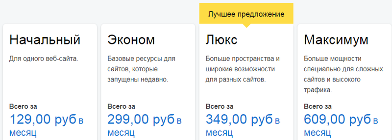 - «Люкс» - стоимость 349 рублей в месяц, включает в себя полный набор опция пакета «Эконом», а также дополнительно: неограниченное количество сайтов, неограниченное пространство на диске, безлимитное число суб-доменов;