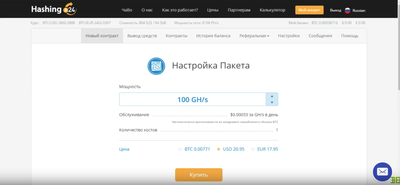 На сегодняшний день минимальный контракт в размере 100 GH/s будет стоить $31,95 или 0.007196 BTC. А плата за обслуживание составляет $0,00033 за GH/s в день. Выплата за обслуживание автоматически осуществляется из ежедневно намайненного объема BTC, в соответствии курса биткойна к доллару на этот день.