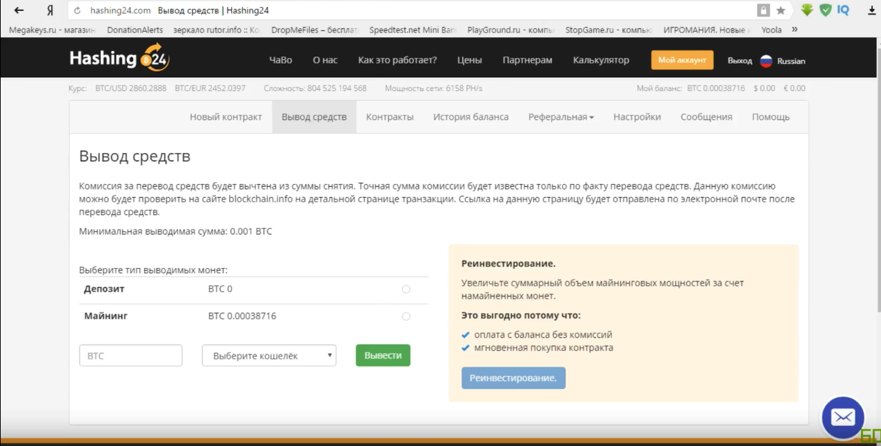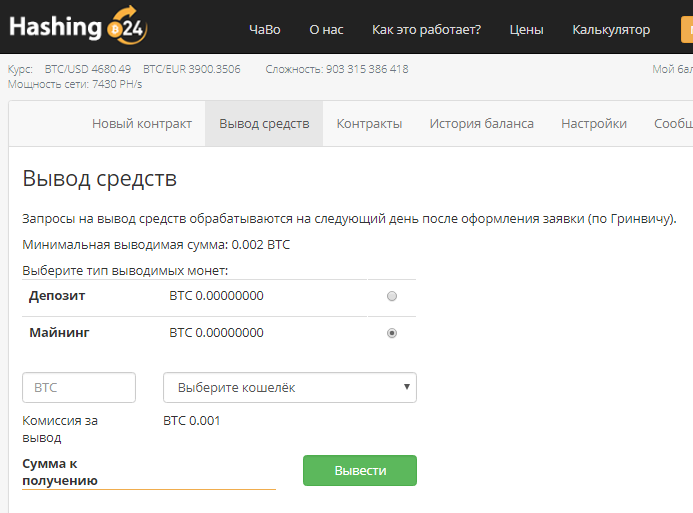 Вывод средств осуществляется на следующий день после оформления заявки (по Гринвичу). И минимальная сумма вывода составляет 0,002 BTC.