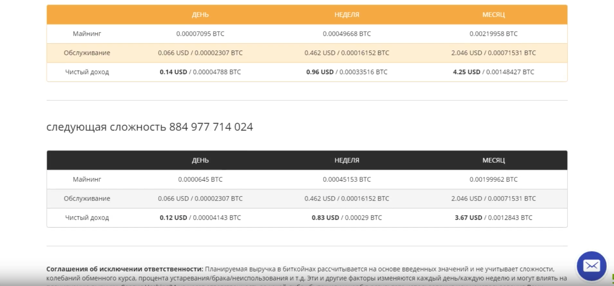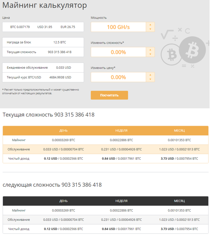 На сайте сервиса можно найти «Майнинг калькулятор». Он позволяет на основе указанной мощности и текущей и следующей сложности майнинга рассчитать приблизительное значение намайненных биткойнов за день, неделю и месяц. Тут же можно изменить сложность и цену в процентном соотношение к текущим значениям. Калькулятор позволит понять каких результатов с течением времени стоит ждать.