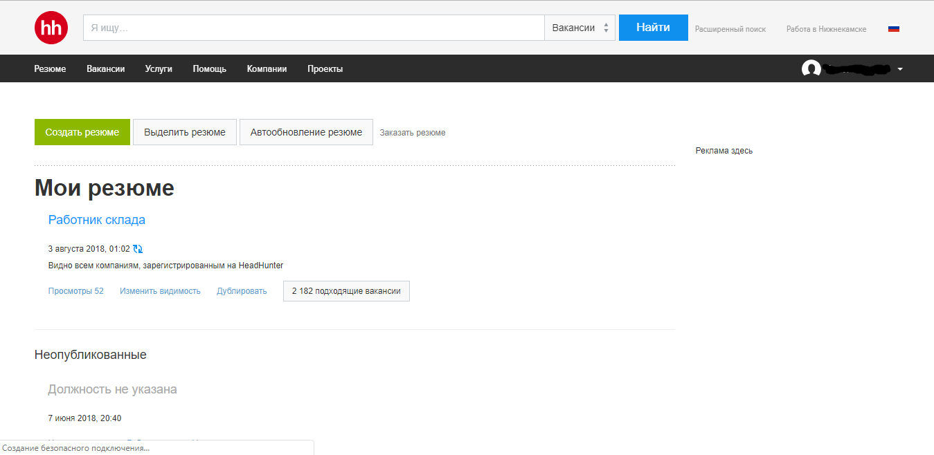 Далее потребуется создать своё резюме или загрузить готовое, если оно у вас есть. При создании вам нужно будет заполнить основную информацию: ФИО, дату рождения, образование, опыт работы, город проживания и т.п. И как можно подробнее расписываем свои качества и профессиональные навыки для привлечения внимания работодателей.