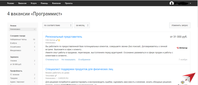 Если подобранные вакансии вас не устраивают, то можно воспользоваться встроенной поисковой платформой для самостоятельного поиска работы. Вводим интересующий вас вид профессии, например, программист, монтажник и т.д. В результате вам откроется большой список всех доступных вакансий с кратким описанием и размером заработной платы. Весь список выдачи можно отсортировать по городу, уровню зарплаты, по требуемому опыту работы, профобластям и т.п. Так же можно выделить время даты публикации вакансии и сортировку по убыванию или возрастаю уровня з/п.
