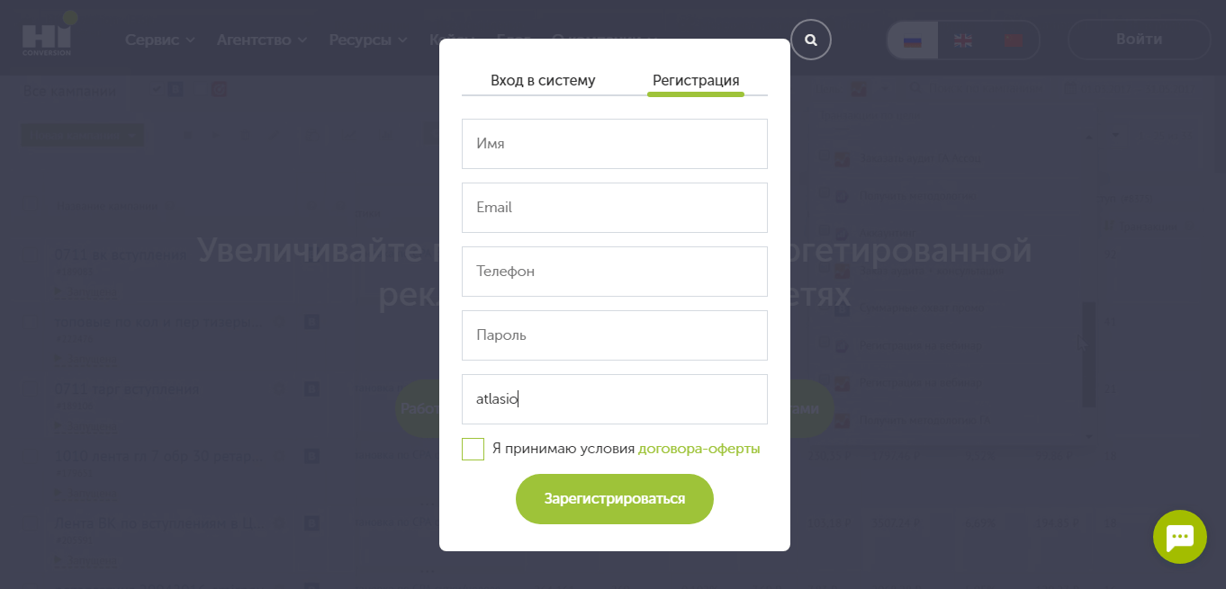 - Клиентский – вариант для пользователей планирующих осуществлять самостоятельное управление своими компаниями посредством использования рекламного кабинета сервиса «HIconversion». Пользователь не ограничен в использовании функционала автоматизации, предоставлена возможность вести работу бюджетом свыше 10.000 рублей.