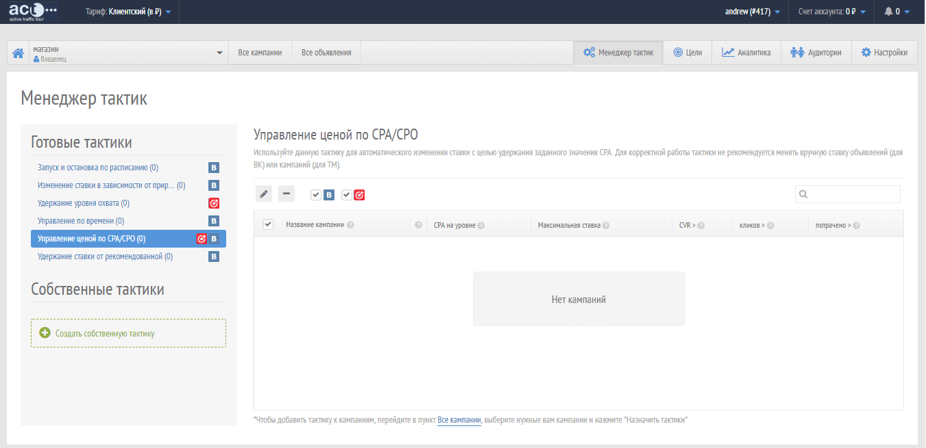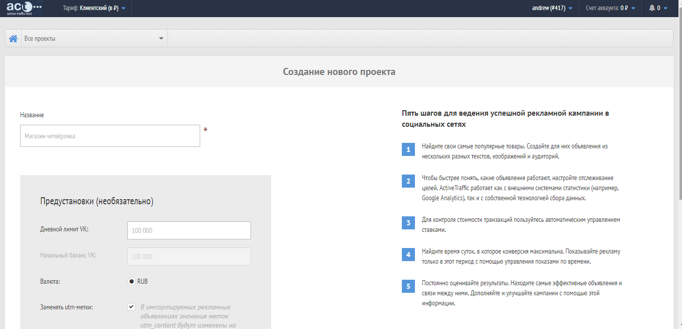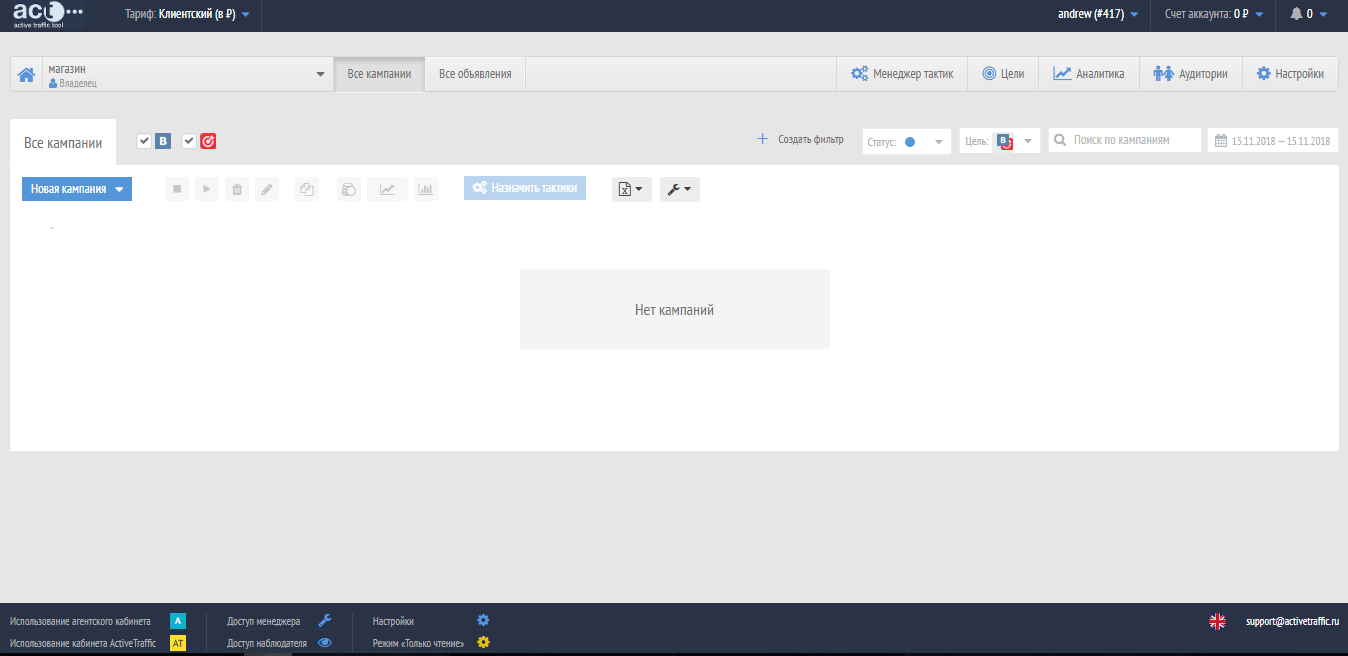- Агентский – пользователь может работать в личном кабинете, с полным доступом к применению всего функционала платформы. Доступно получения рекламных кабинетов на «ВК» и «MyTarget»;