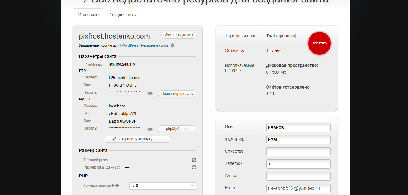 - «Trial» - пробный тариф является абсолютно бесплатным, имеет временной ограничение в 14 дней работы. В него включено размещение 1 сайта и базы данных, выделенное пространство на диске «ССД» в 500 мегабайт;