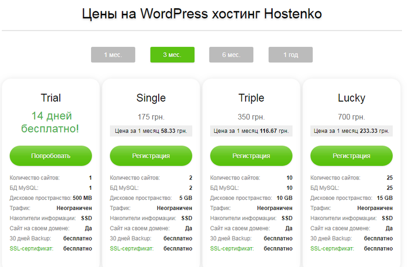 Сервис «Hostenko» предлагает своим клиентам четыре основных тарифных плана, включая бесплатный 14-дневный тестовый режим: