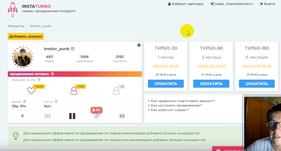 Так же есть возможность зарабатывать деньги, став партнером InstaTurbo. Привлекайте новых клиентов, и вы будете получать вознаграждение с каждой оплаты привлеченного человека.