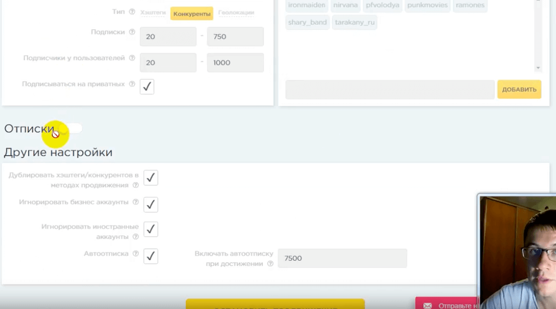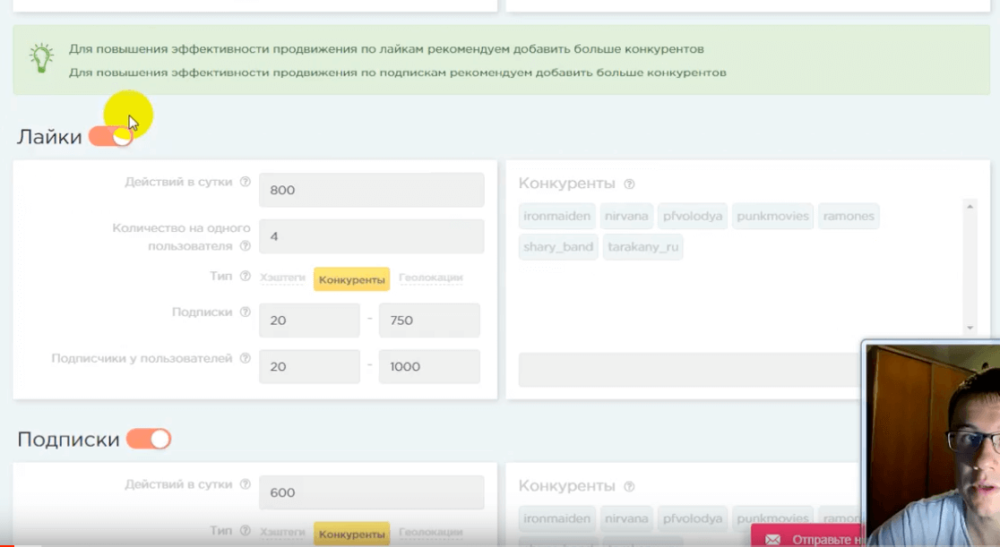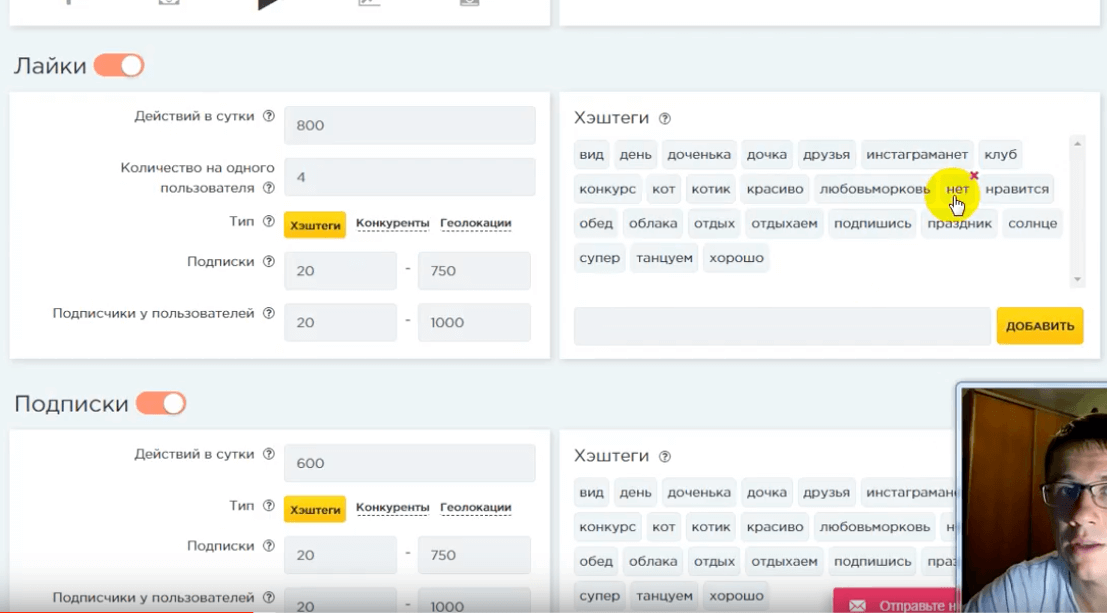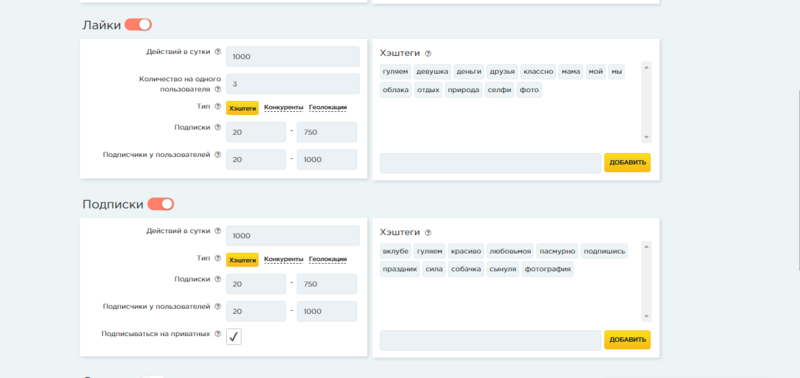 Ниже расположены настройки и фильтры действий, которые будет совершать сервис. Для каждого процесса доступны расширенные настройки для таргетирования аудитории. Вы можете указать количество действий на одного пользователя, выбрать ограничения в сутки, задать тип получения аудитории: по конкурентам, геолокации или хэштегам.