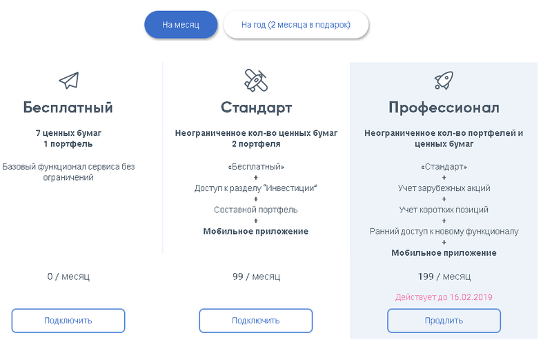 - «Профессионал» - стоимость составляет 200 рублей в месяц, портфели и сделки доступны в неограниченном количестве, также включает в себя все дополнения пакета «Стандарт», плюс ранний доступ к новому функционалу и техподдержка премиум класса, с наивысшим приоритетом.