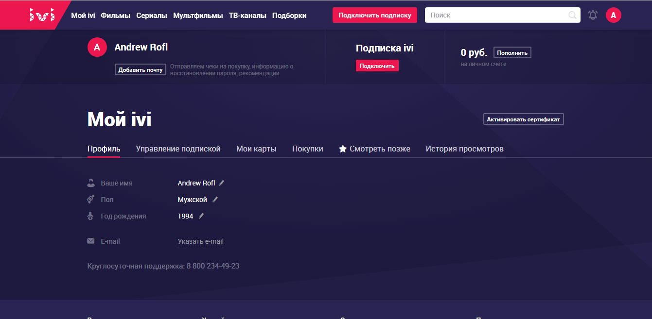 В своем личном кабинете вы можете найти историю просмотров, и при переходе, на видеоматериал, который вы не досмотрели, воспроизведение начнется с того момента где вы остановились. Здесь же доступны покупки, фильмы, которые собираетесь посмотреть позже и управление подпиской сервиса.