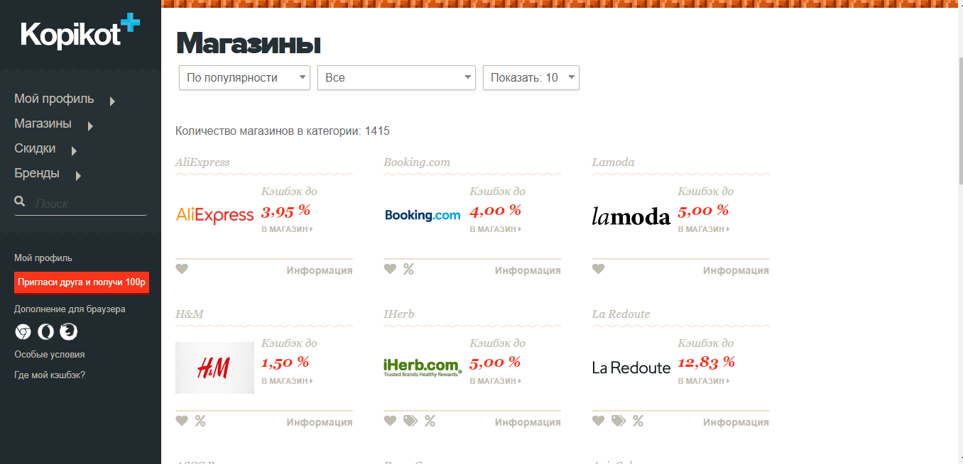 Kopikot.ru - это крупнейший в России кэшбек сервис, который был разработан и запущен в 2011 году. Сайт работает в нескольких странах СНГ, при этом для каждого региона доступны свои интернет магазины с большим процентом возврата денег с покупки. Сервис является составной частью финской компании Bonusday, и главный офис соответственно находится в городе Хельсинки.