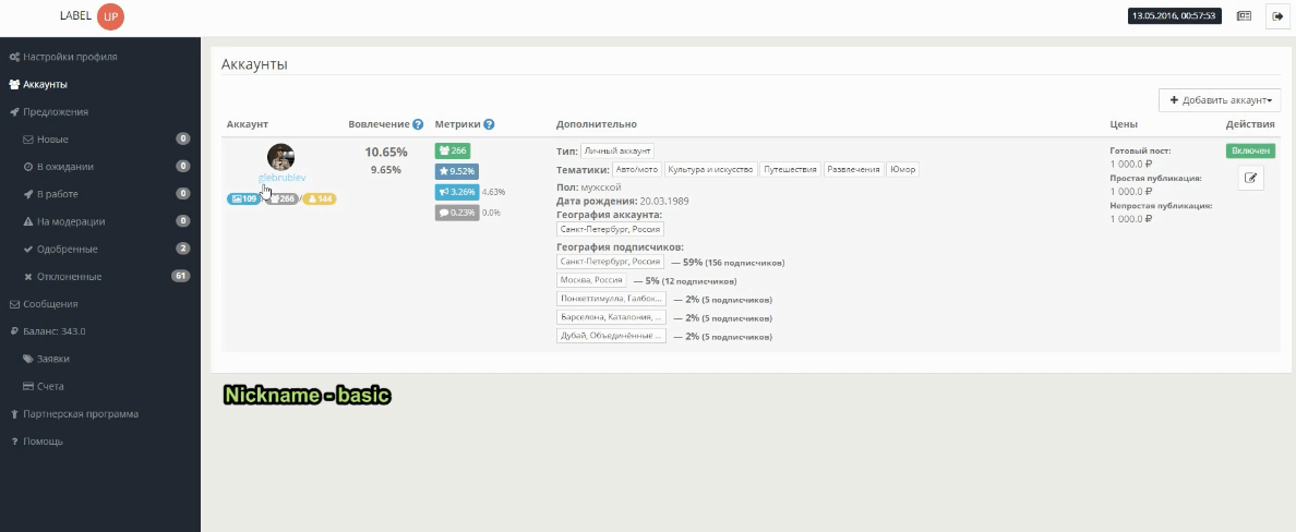 LabelUp — это площадка для рекламы, обеспечивающее посредничество рекламодателей с одной стороны и исполнителями с другой. То есть между теми, кто хочет заказать рекламу и теми, кто будет ее выставлять на своем аккаунте социальной сети.